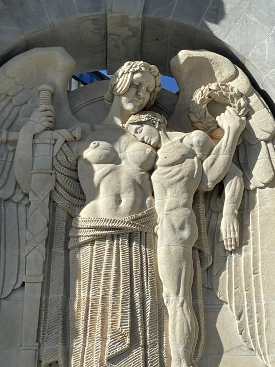 The front façade faces North Terrace and features a powerful bronze sculpture by Rayner Hoff depicting the “Spirit of Duty” with a winged angel rising above fallen soldiers, symbolizing the triumph of spirit over death.