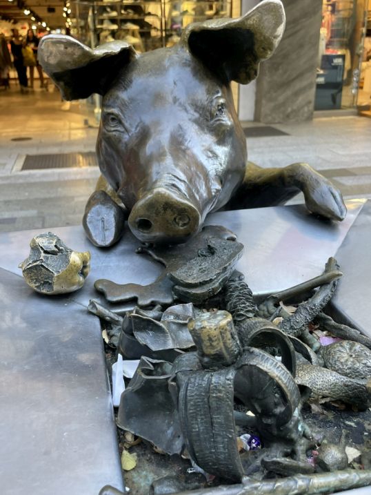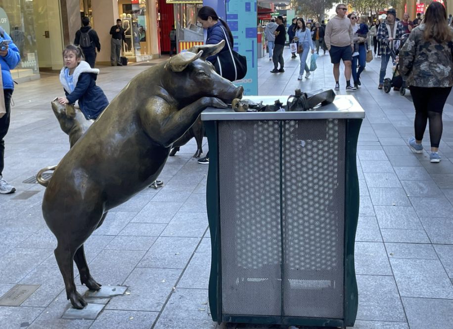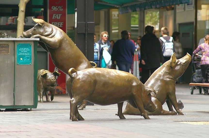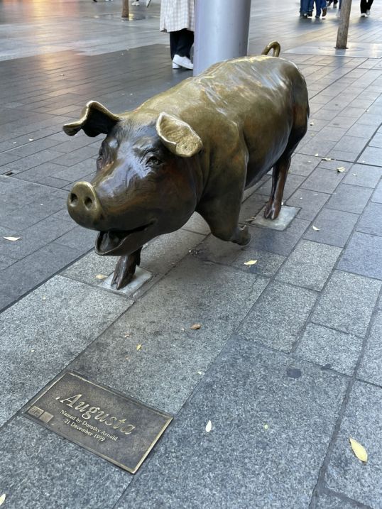The pigs scattered along Rundle Mall. They’re made of bronze, slightly polished by years of people touching them for luck and photos.