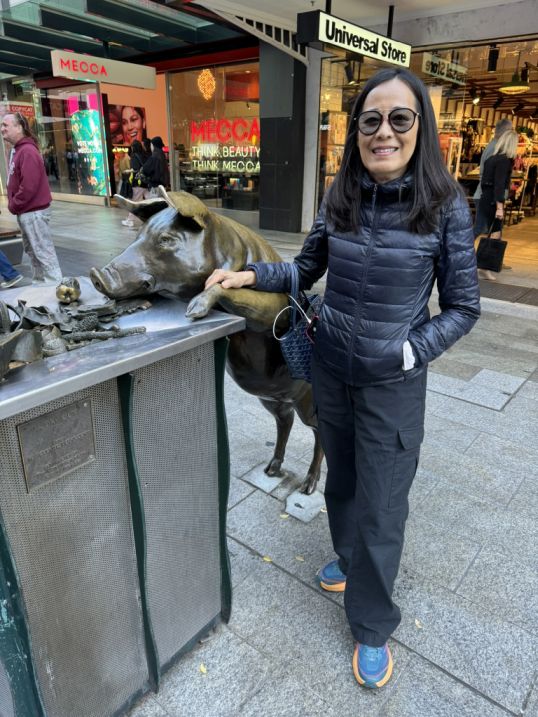 The pigs were inspired by the idea that Rundle Mall is a place where people “forage” for the best deals and treats, just like pigs hunting for truffles! Their playful poses and life-sized design invite people to interact, pat, and take photos with them.