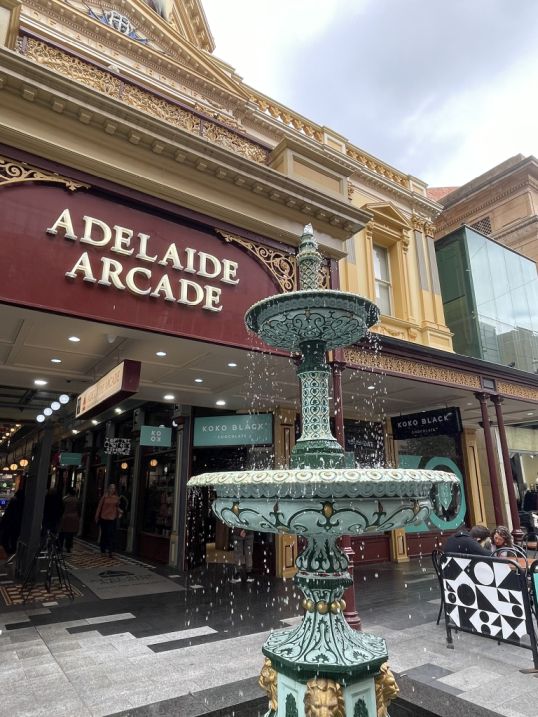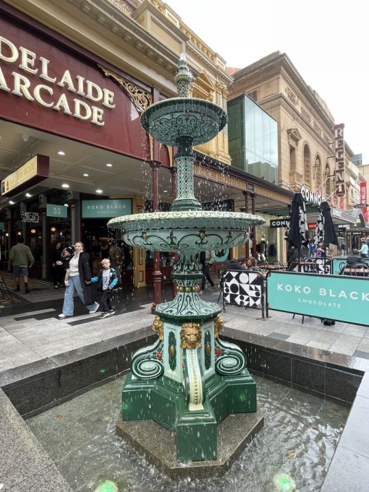 Right in front of the arcade’s entrance on Rundle Mall sits the Adelaide Arcade Fountain, an elegant cast-iron structure that adds to the historic atmosphere of the mall. The fountain was installed in the late 19th century and has been carefully restored over time. It features tiered basins with delicate detailing, topped by a small finial, and water gently flowing into the circular basin below.