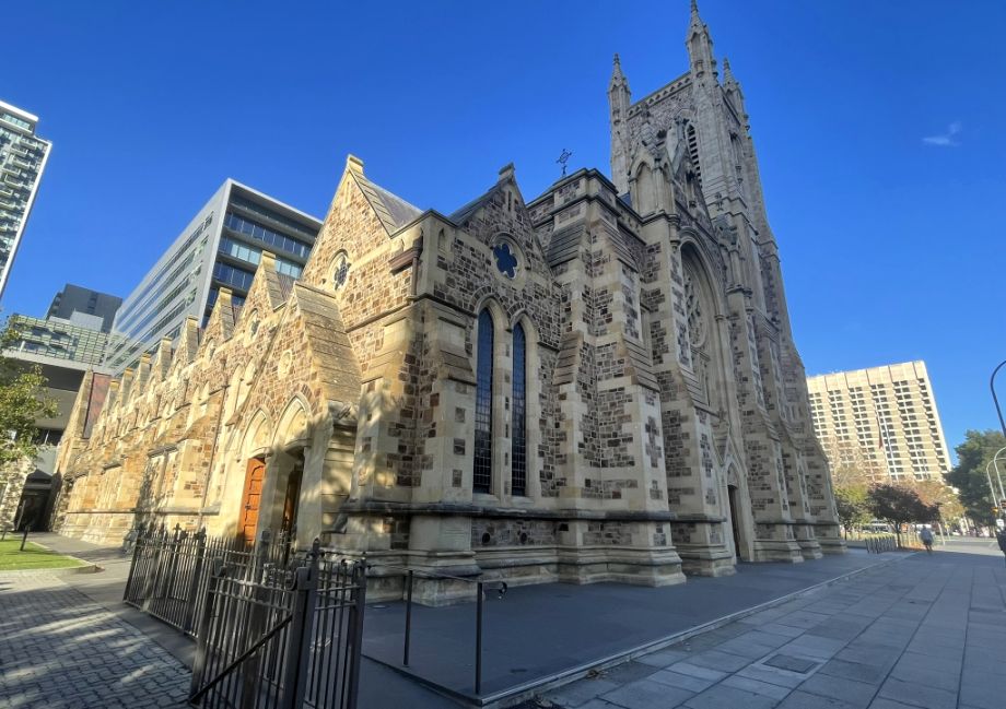 The original design was by English architect Richard Lambeth, in the Gothic Revival style that was inspired by medieval European cathedrals. The cathedral is built mainly from stone quarried in Adelaide and Glen Osmond, giving it a warm cream-grey tone that stands out beautifully against the blue South Australian sky.