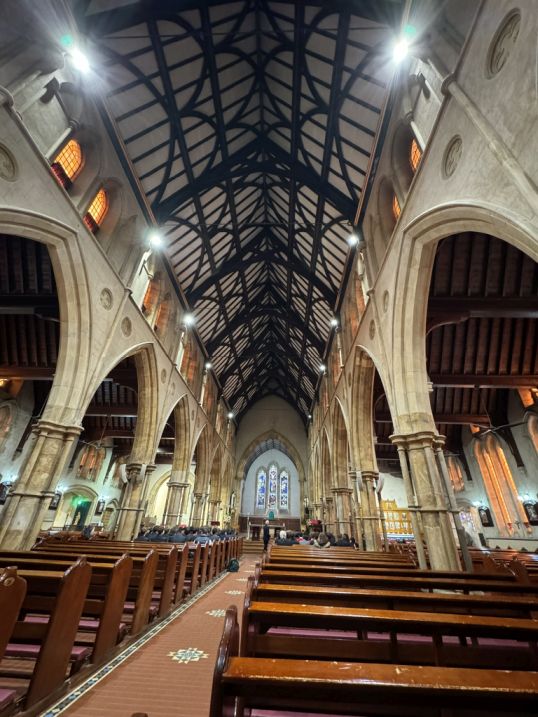 The rows of pointed arches, supported by stone columns, frame the view and guide your attention forward, almost like a visual pathway toward the sacred heart of the church.