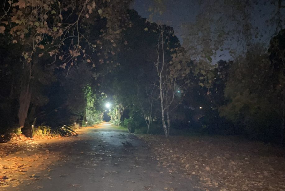 We walked along a quiet pathway surrounded by tall trees, their branches forming a canopy above us. Then, through the darkness, a soft golden light began to appear ahead.
