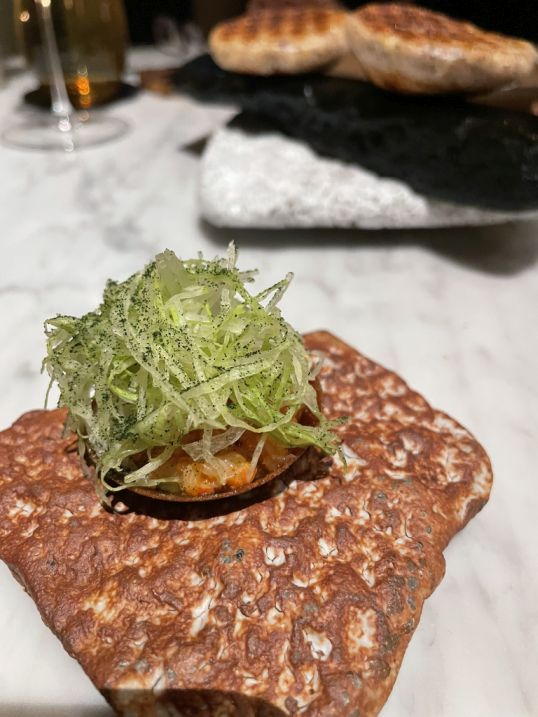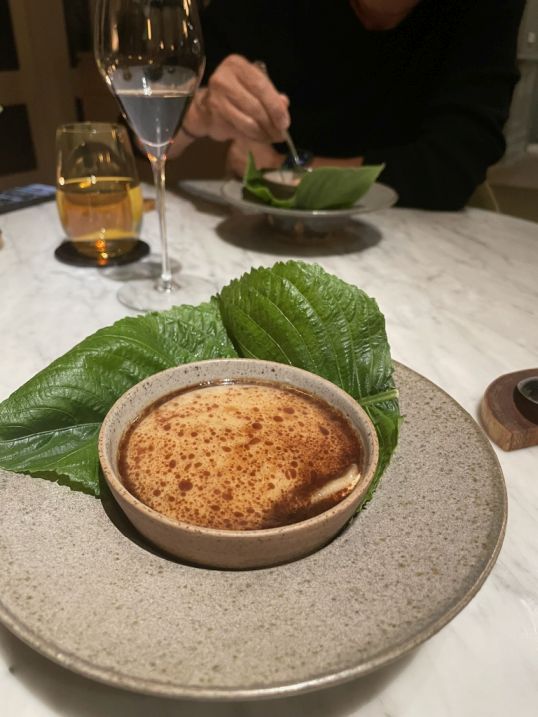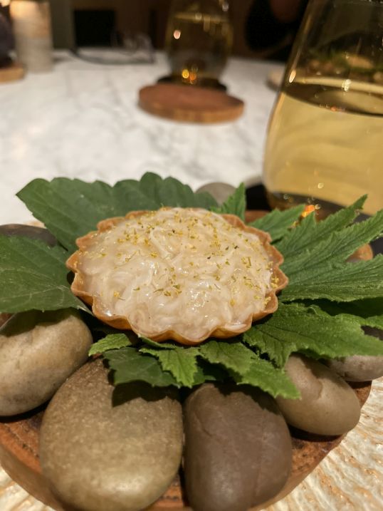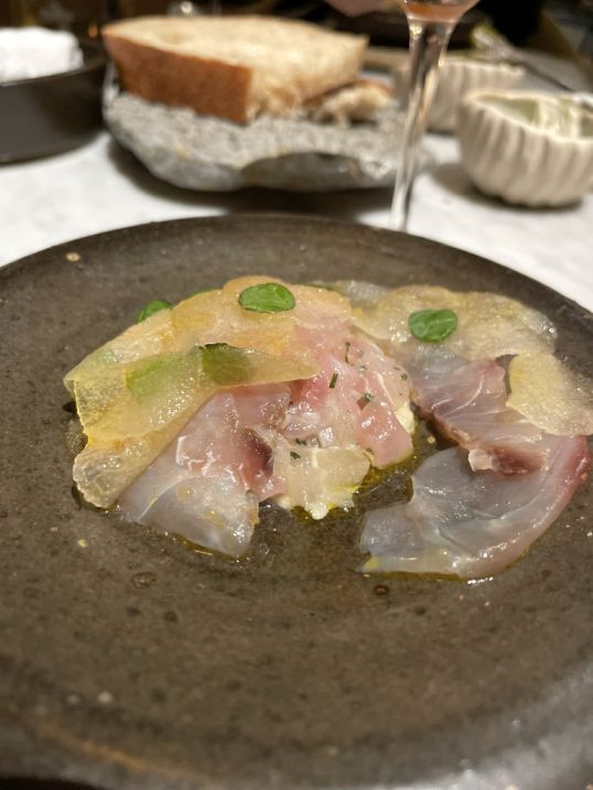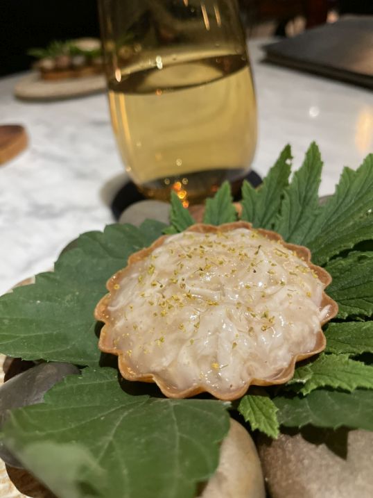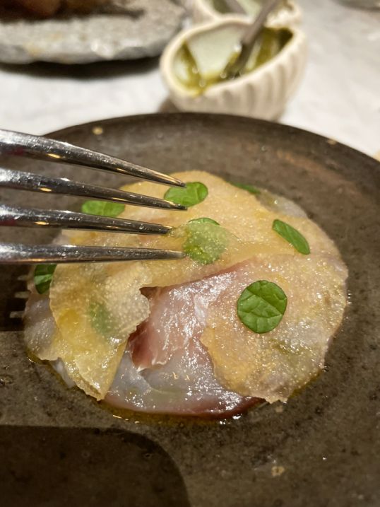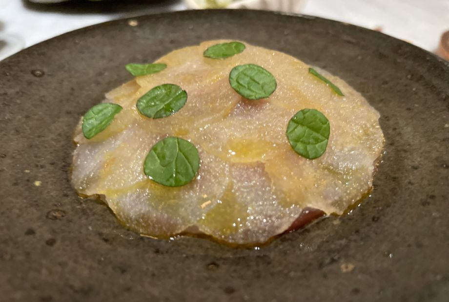 The next dish was a hamachi crudo, arranged in a perfect circular mound. On top, a thin layer of pear was laid so delicately it looked almost translucent, each slice overlapping like soft petals. Scattered over the pear were small, round-cut leaves, precise and symmetrical, adding a touch of green that made the whole dish look like a living piece of art.