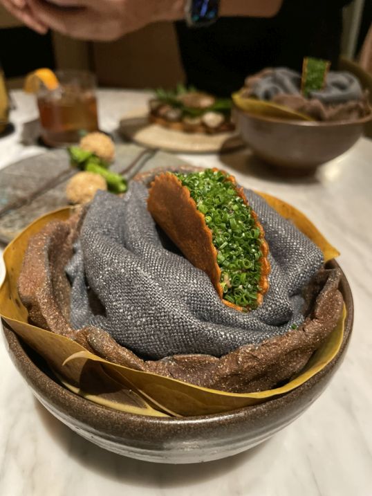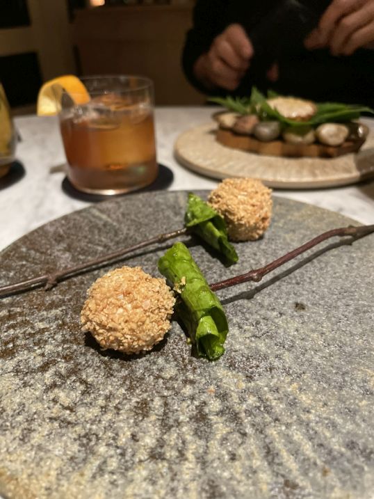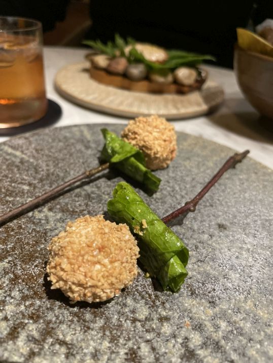 We were served a playful little bite, a radish lollipop paired with a small roll of green leaves beside it. The presentation was whimsical, almost like something from a garden in miniature.