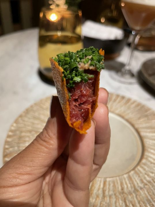 The meat was finely chopped and tender, with a deep, clean flavor that captured the essence of the Australian landscape. It was carefully seasoned, with chives and a hint of smokiness that gave it depth without overpowering the freshness of the meat. Served elegantly on the plate, it was rich yet light, and every bite felt balanced and precise, adventurous, but refined.