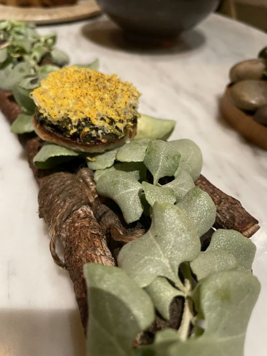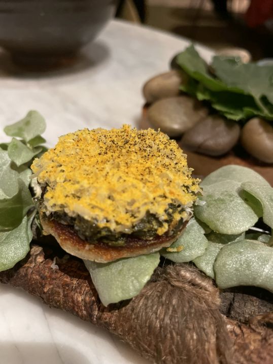 Small toast with saltbush was presented so beautifully that we almost didn’t want to touch it. The toast rested on a branch tied with rope, decorated with sprigs of saltbush leaves, looking like something freshly gathered from the wild. The toast itself was crisp and savory, infused with the gentle, salty aroma of the saltbush.