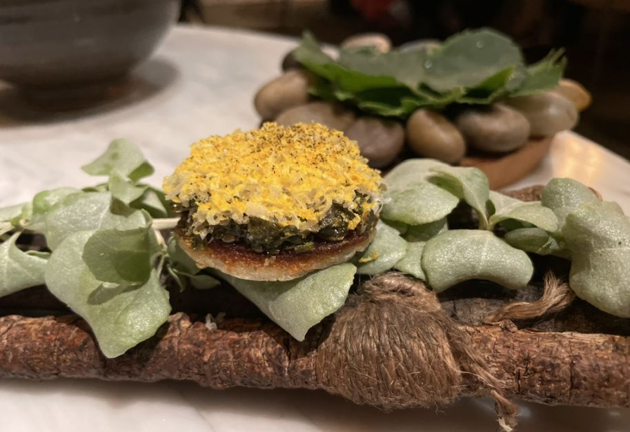 The radish lollipop was crisp and cool, with a gentle peppery bite balanced by a smooth, slightly creamy center. The rolled greens added a fresh, earthy note that complemented it perfectly. Together, the two pieces felt like a refreshing pause in the meal, light, clever, and beautifully in tune with the garden setting around us.