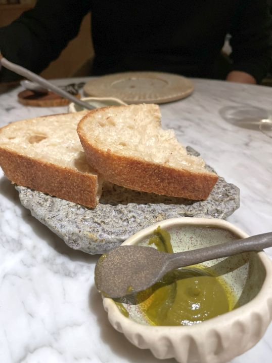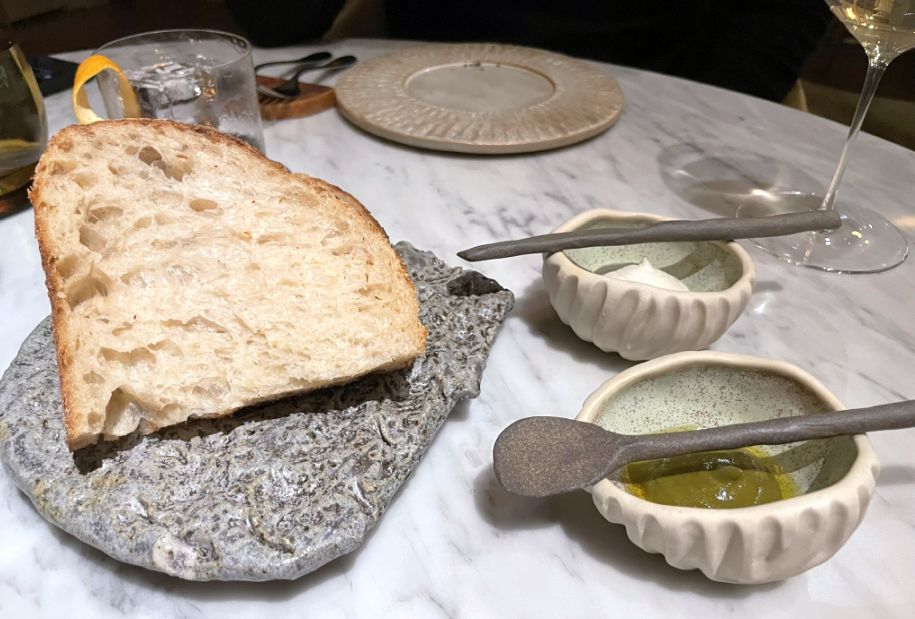 The sourdough bread came with butter and I don't remember what the green sauce is.