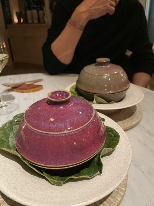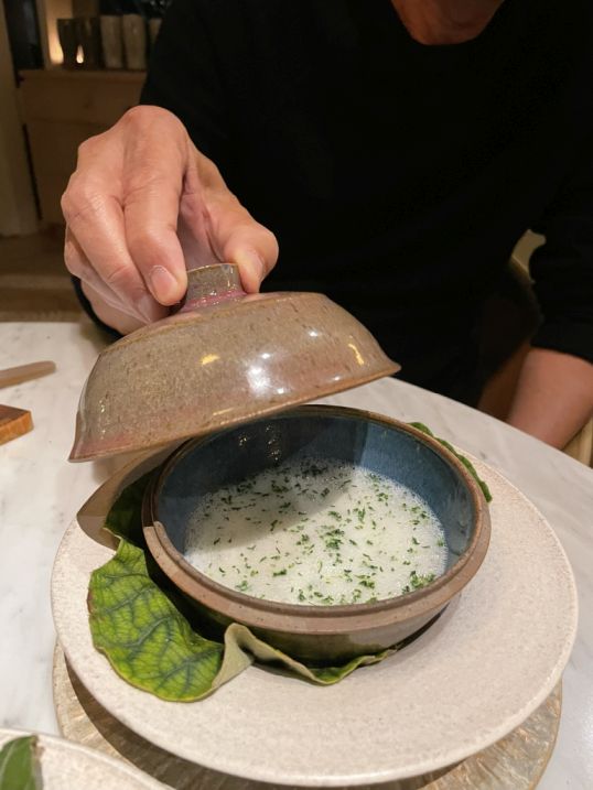 The next dish arrived in a rustic clay pot, its lid was gently lifted to release a fragrant cloud of steam that filled the air with earthy and marine notes.