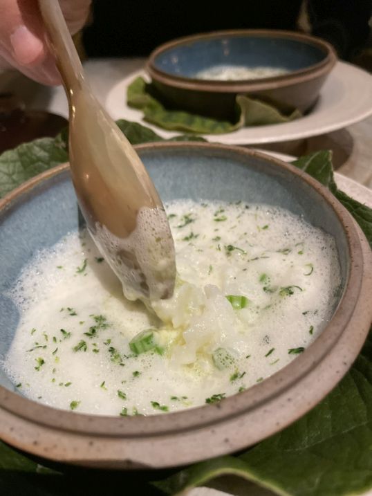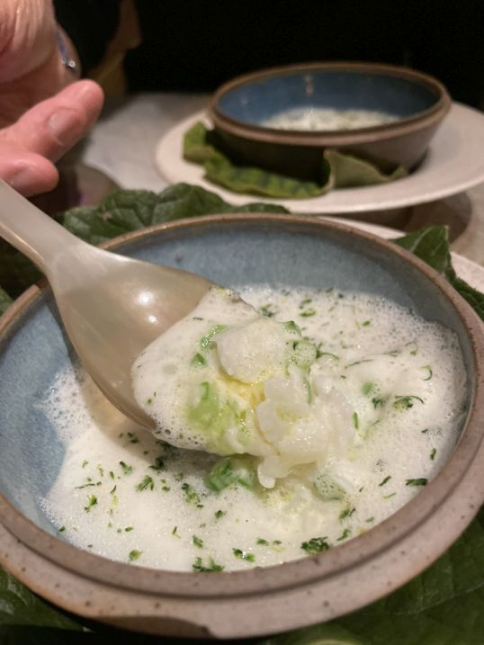 Inside was a silky, white soup, velvety and warm, with a delicate foam resting on the surface and a scattering of finely chopped green onion. It felt like a refined chowder: comforting, elegant and full of subtle flavor.