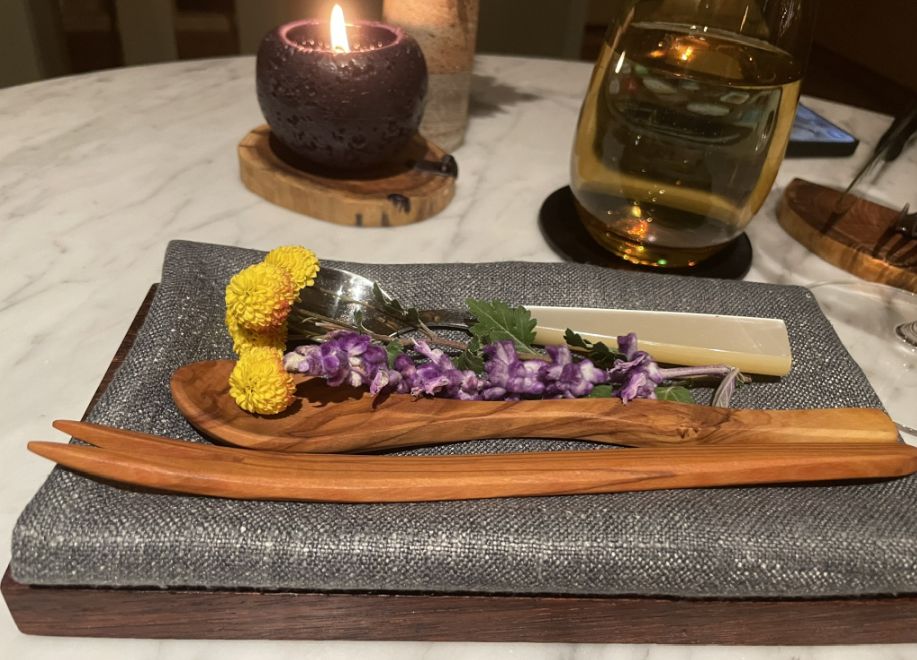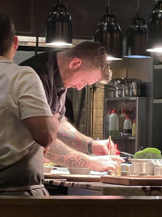 As we sat at our table, we could see all the chefs working behind the counter. Each one moved with quiet precision, focused, calm, and completely absorbed in their craft. It felt almost like watching a performance, every motion deliberate and graceful. In the center stood Justin James, guiding the flow of the kitchen with quiet authority.