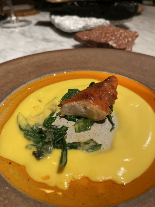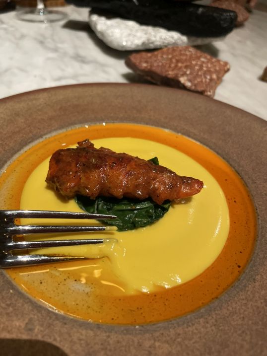 The next course was truly striking, a roasted Australian lobster tail resting on a small bed of deep-green leaves, surrounded by a ring of silky, golden carrot purée. The purée was so smooth it looked like glass, and around it glowed a halo of orange oil that caught the light beautifully. The lobster was tender and slightly caramelized, its surface glistening with a buttery glaze. The greens underneath added a subtle earthiness, balancing the sweetness of the carrot and the richness of the shellfish. The presentation was perfectly circular, vibrant, refined, and full of warmth.