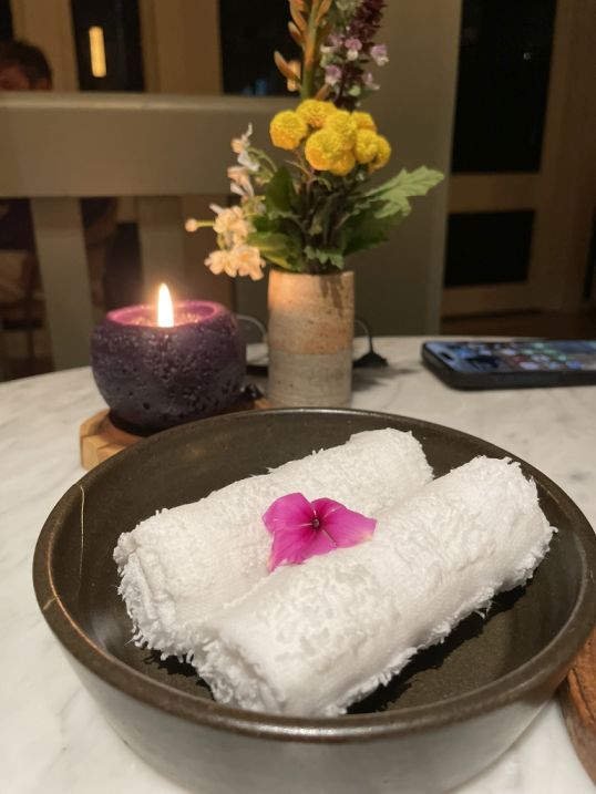 Upon being seated, the waiter immediately presented us with a bowl and compressed white napkins to cleanse our hands, an elegant touch that began the meal.