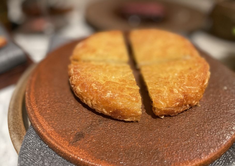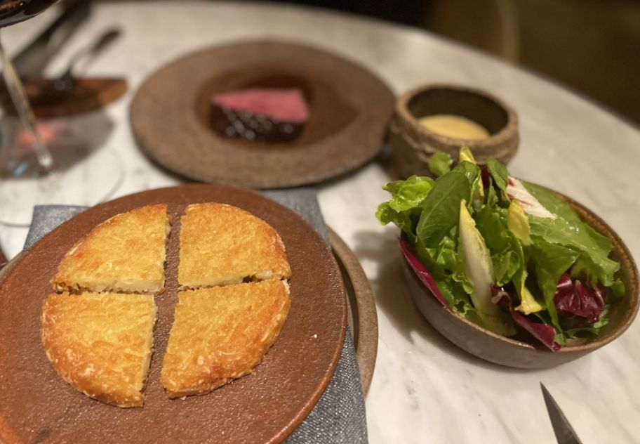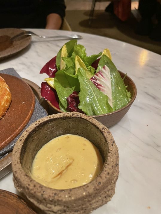 On the side was a crisp, golden potato galette, its layers thin and delicate, each bite buttery and perfectly seasoned. The plate was balanced with a small side of fresh mixed salad and a smooth mayonnaise-style sauce that added a cool, creamy contrast.