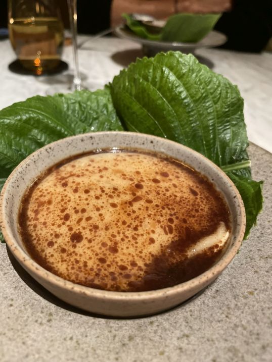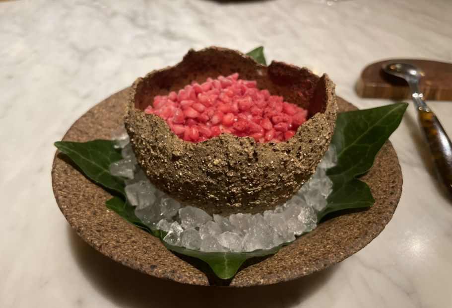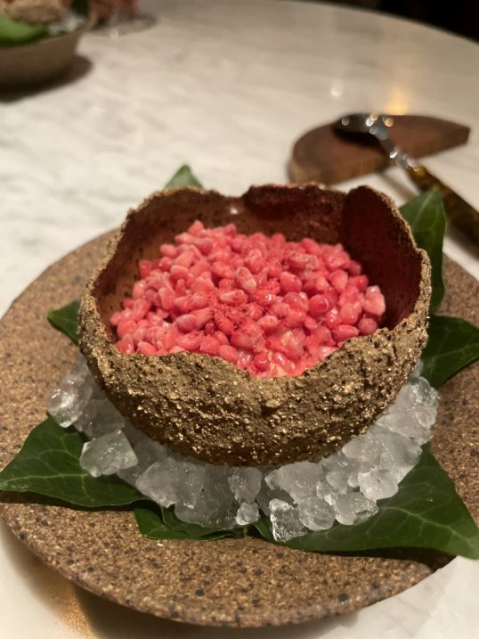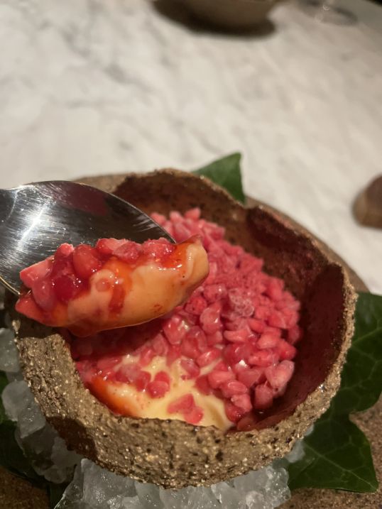 The first dessert was absolutely stunning! A creation that looked almost like a tiny winter garden. It was served in a rustic brown bowl set over a bed of ice, with fresh green leaves arranged around it for a touch of natural beauty. Inside the bowl were frozen red grains, perhaps raspberries or another bright fruit, their shape slightly altered so they looked crystalline and delicate. Beneath the icy surface was a smooth, rich custard that added warmth and depth to the bright, tangy flavor of the fruit. The contrast between cold and creamy, rough and silky, made the dish both surprising and elegant — a beautiful play between texture and temperature.