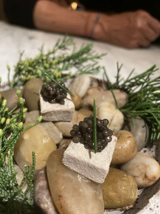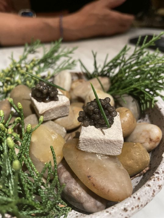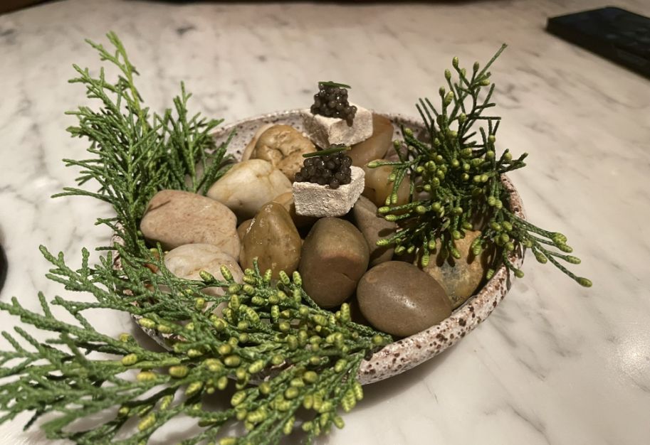 The final dessert was a true showpiece. It arrived in a striking bowl filled with smooth river rocks and pine needles, evoking the scent and stillness of the forest. Resting on top of the rocks was a small square that looked like tofu, though it wasn’t, its pale, creamy surface contrasted with the dark glisten of caviar delicately placed on top. The presentation was mesmerizing: natural, minimal, and deeply sensory. It brought together earth, sea, and craft in a single, perfect closing bite.