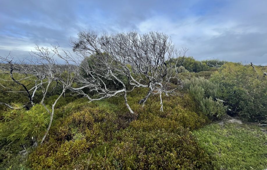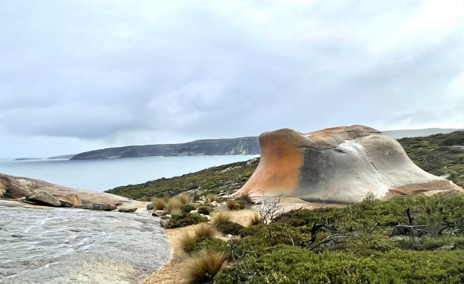 All around the base of the granite dome, you’re seeing low coastal bushland, a resilient ecosystem adapted to strong winds, sandy soil, and salt air. These are mostly heath plants and coastal shrubs, which grow low and dense to resist the gusts that sweep in from the sea.