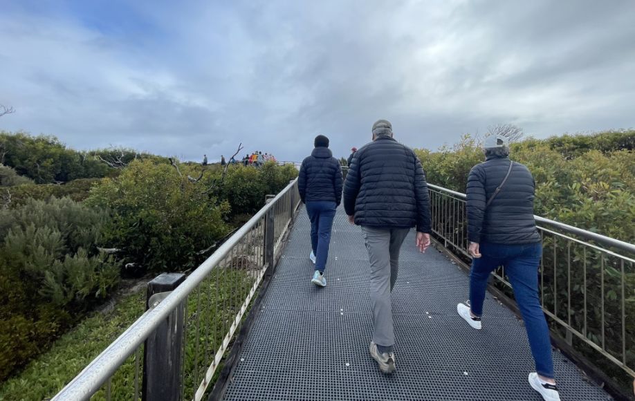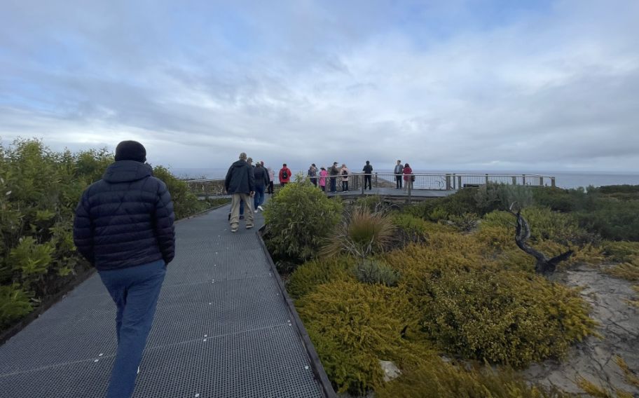 As we walked further, the path rises slightly, and then, quite suddenly, the landscape opens up. Ahead is the Southern Ocean stretches endlessly, and the silvery clouds above cast a pale glow over the landscape. The green shrubs and re-growing trees along the path appear deeper and richer in color.
