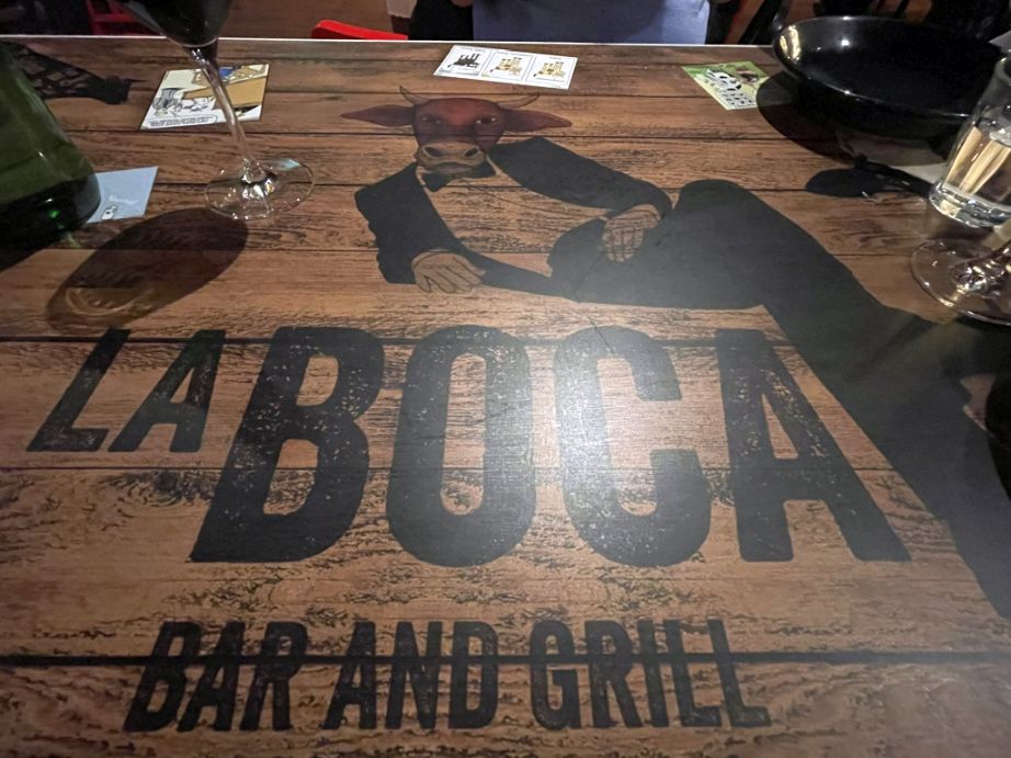 The table we sat at with “La Boca Bar and Grill” written on top and a cow in a tuxedo lying down is part of the restaurant’s playful, artistic décor that celebrates Argentinian culture with a touch of humor.