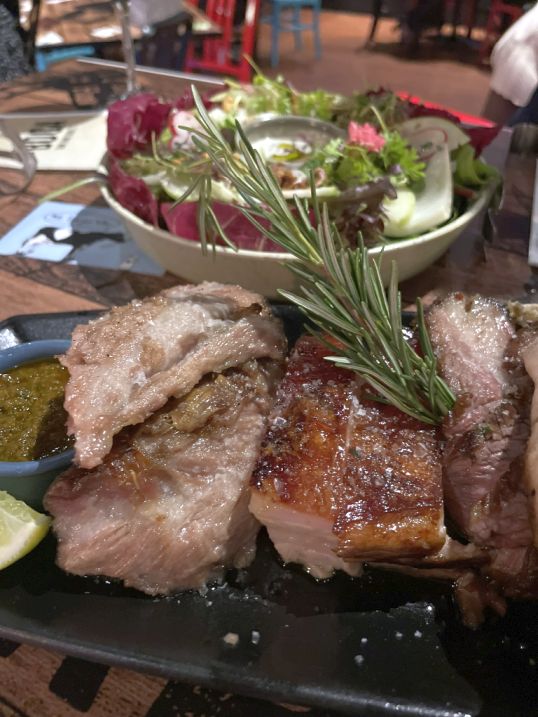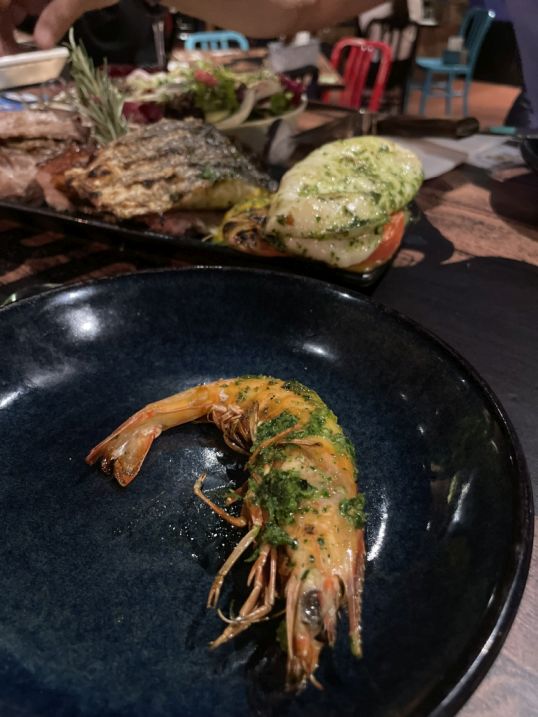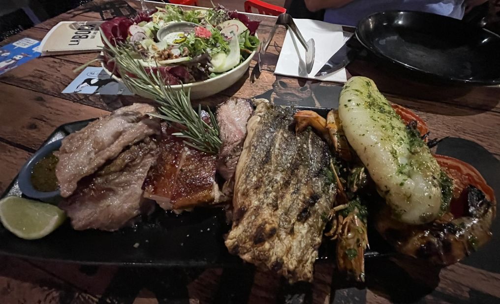 The platter features free range signature beef asado, lamb asado, pork belly asado, Barramundi, sous vide grilled squid and green tiger prawn with house made chimichurri sauce.