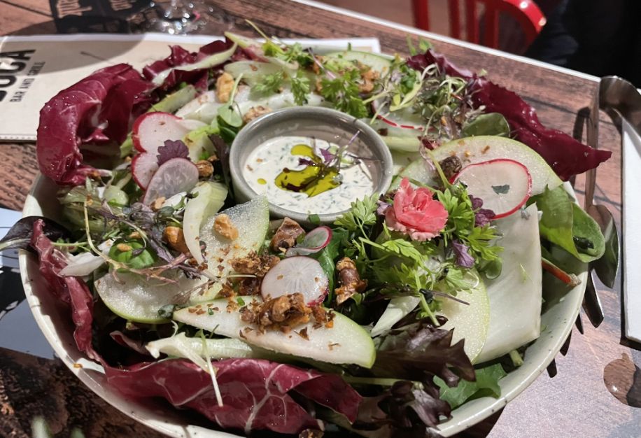 Mixed salad with celery, green apples, mixed lettuce, walnut an buttermilk dressing.