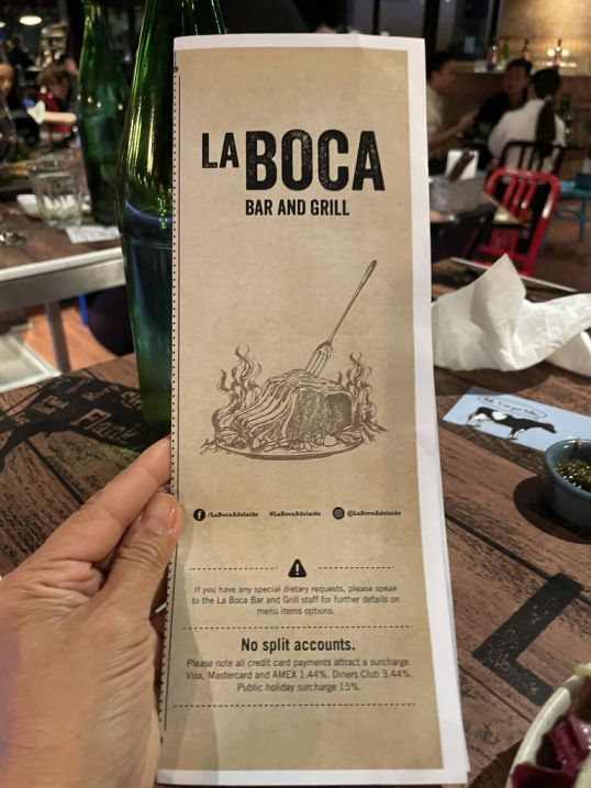 After walking around, we decided to eat at La Boca and Grill in Downtown Adelaide.