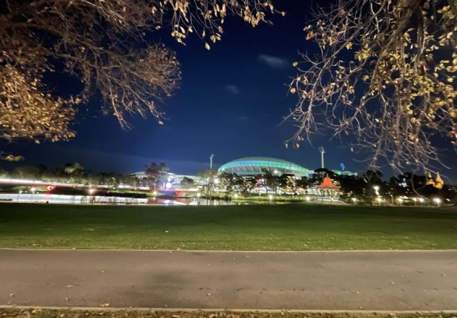 Elder Park at night is one of Adelaide’s most picturesque spots. The park sits right along the River Torrens (Karrawirra Parri), at the northern edge of the city center, and offers great views of the Adelaide Oval, which is the stadium that is glowing across the river.