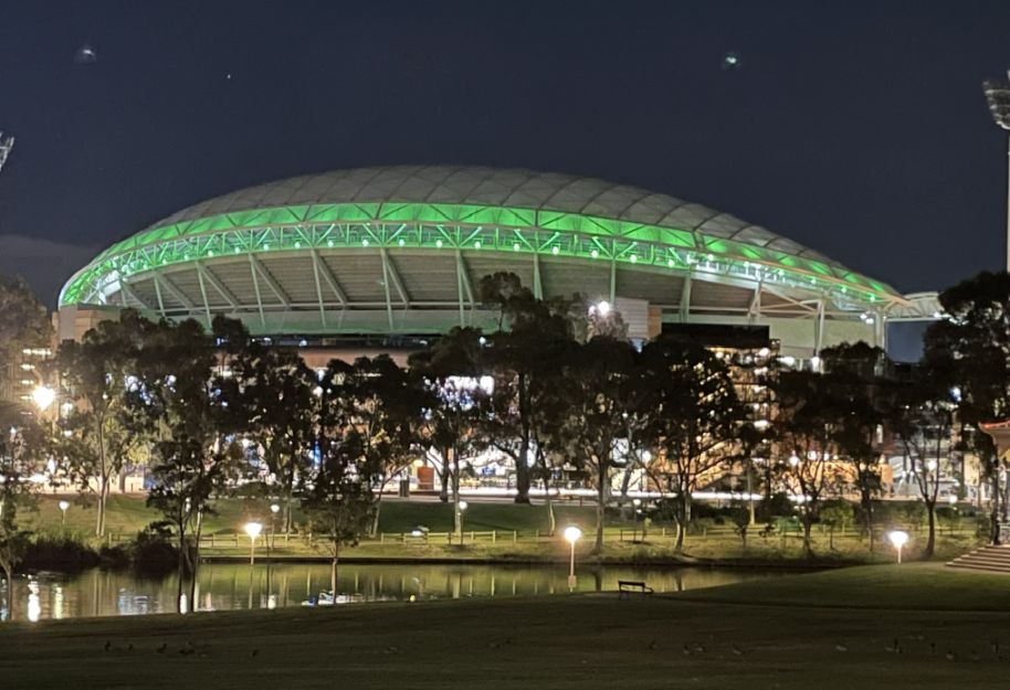 The Adelaide Oval is illuminated in shifting colors that reflect major events, from cricket and football games to concerts and festivals.
