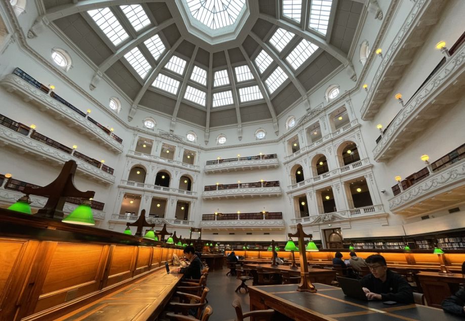 We are now in La Trobe Reading Room, first opened in 1913, often called the Domed Reading Room, located on the 2nd floor and is the heart of the State Library Victoria. The space is famous for its octagonal design, with soaring white columns, wooden desks arranged in a radial pattern, and a majestic glass-and-steel dome overhead, one of the largest of its kind in the world when it was built.