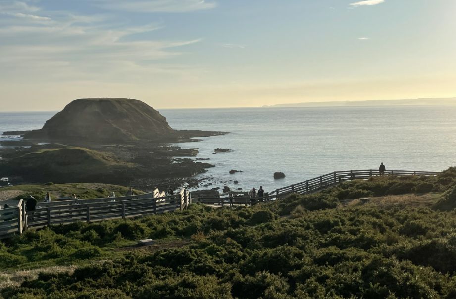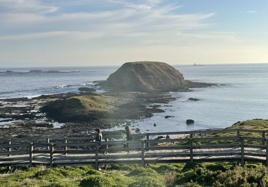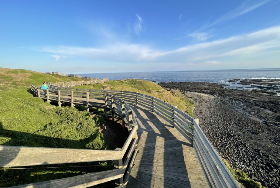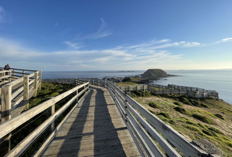 The Nobbies boardwalk stretches for about 3/4 of mile (round trip), winding along the rugged cliff tops. It follows the coastline with several lookout points where you can stop to take in sweeping views of Bass Strait, Seal Rocks, and the blowhole. The walk isn’t very long or difficult, but it feels expansive because of the dramatic scenery and the way the path hugs the edge of the coast, giving you new perspectives with every turn.