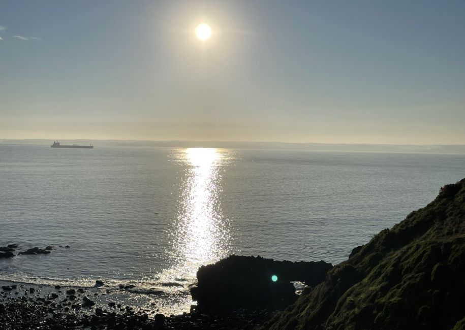 Around 4 to 5 pm, the sun began to dip toward the horizon, casting a golden glow across the cliffs and ocean, with shimmering reflections dancing on the water