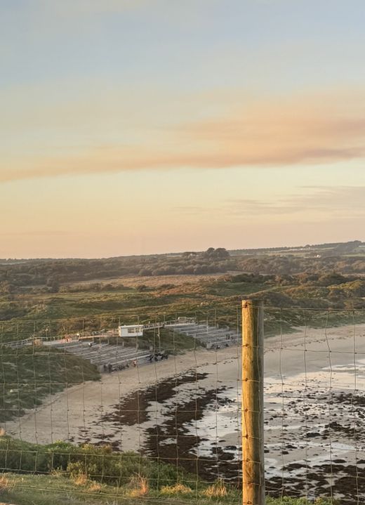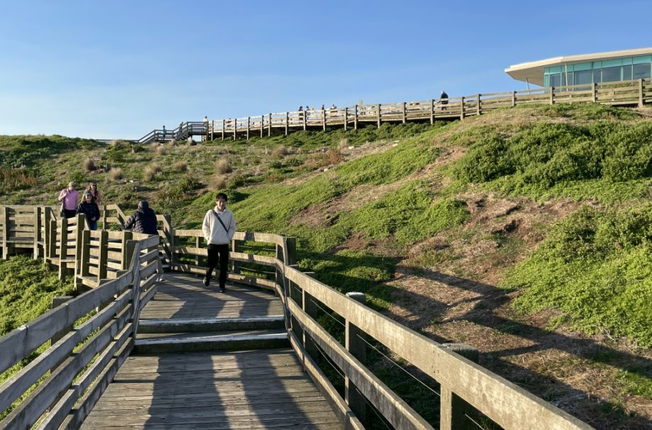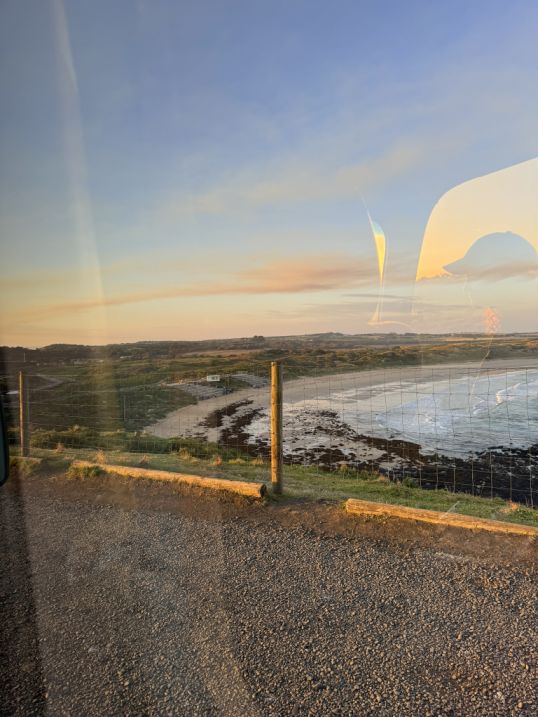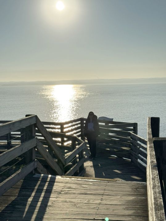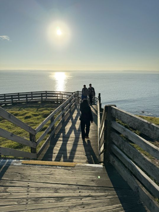 As we walked along the wooden boardwalk, the view is breathtaking. The sun sinks lower on the horizon, casting a golden glow across the water, while the waves shimmer with light.