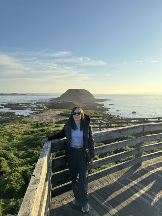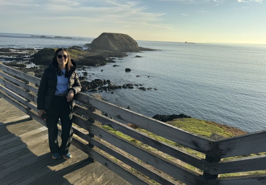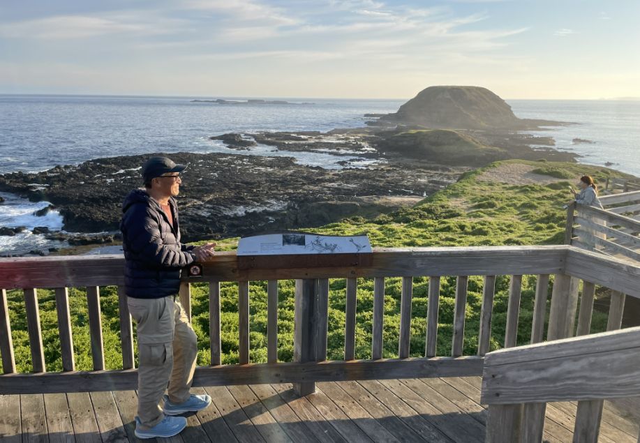 Hoa leaning against the wooden rail with the Nobbies’ rugged cliffs and rocky outcrops rising beautifully in the background.