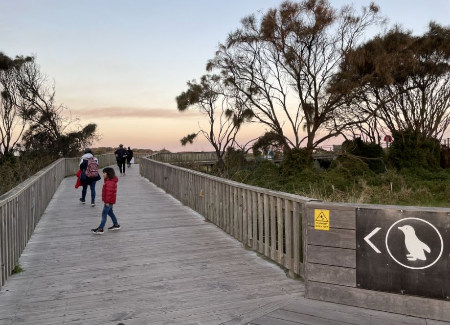 Once the first groups of penguins emerge from the sea and begin their waddle up the sand, the viewing experience doesn’t end there. Visitors can continue watching them by following the boardwalk platforms that wind through the dunes. The pathways are raised to protect the fragile habitat, but they bring you surprisingly close to the penguins as they make their nightly journey inland. Walking along the platform, you see penguins just a few feet away, some slipping under the boardwalk, others crossing right beside it to reach their burrows. The design of the pathways means you can follow the penguins without disturbing them, almost as if you’re traveling alongside them on their return home. It feels like being part of a quiet procession: people moving carefully on the platforms above, and the little penguins shuffling determinedly below, each one making its way back to the safety of its burrow for the night.
