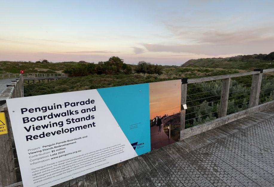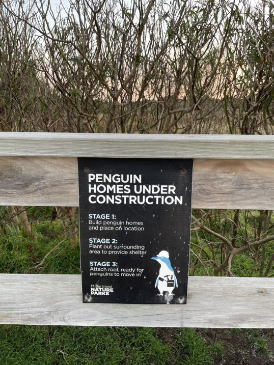 On Phillip Island, rangers and conservation staff sometimes build artificial penguin burrows to support the colony. These are small wooden or plastic nest boxes, placed in the dunes or among vegetation, that provide safe, dry spaces for the penguins to breed and shelter. They’re especially helpful in areas where natural burrows have been damaged or lost due to erosion, vegetation changes, or past human activity. This sign means that the park’s wildlife team is actively installing or repairing these burrows. The goal is to give the penguins extra protection and help the colony grow.