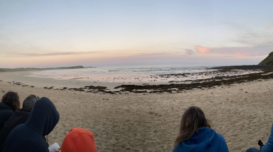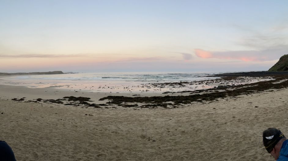 The beach stretches on a pale sandy beach that slopes gently into the the Bass Strait. The water is tinged with the colors of dusk as waves roll steadily ashore.