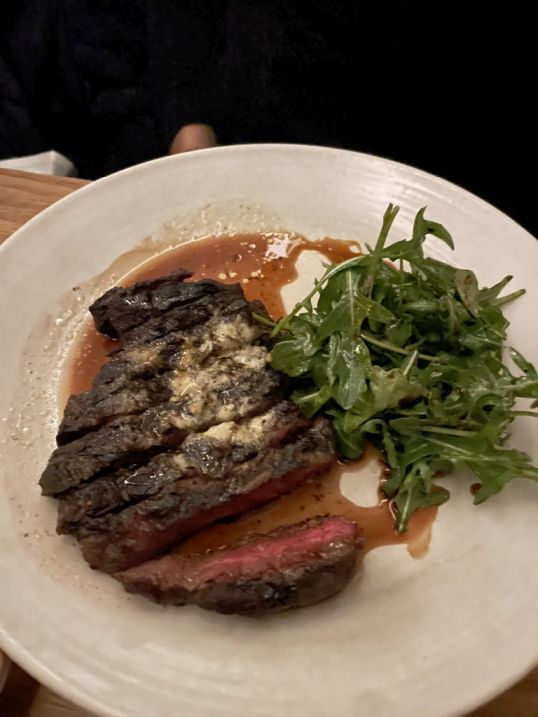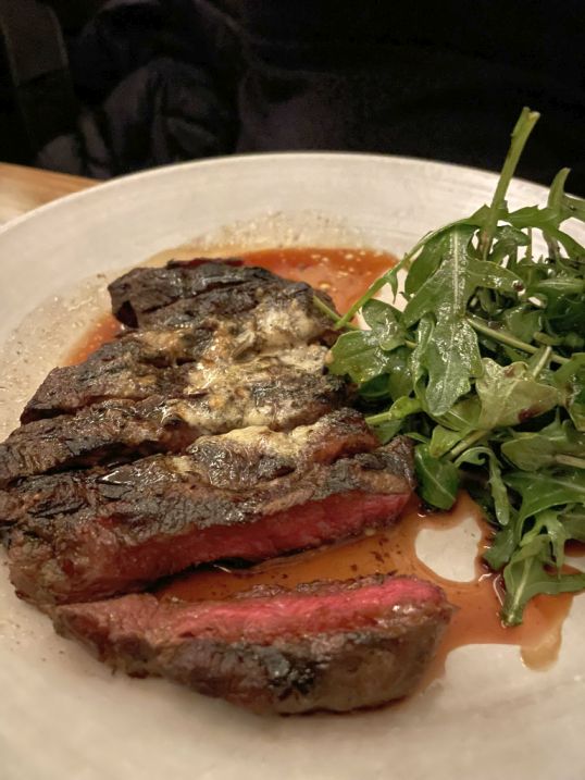Flat iron steak (Gippsiand, pasture fed) , confit garlic butter, rucola, aceto balsamic.