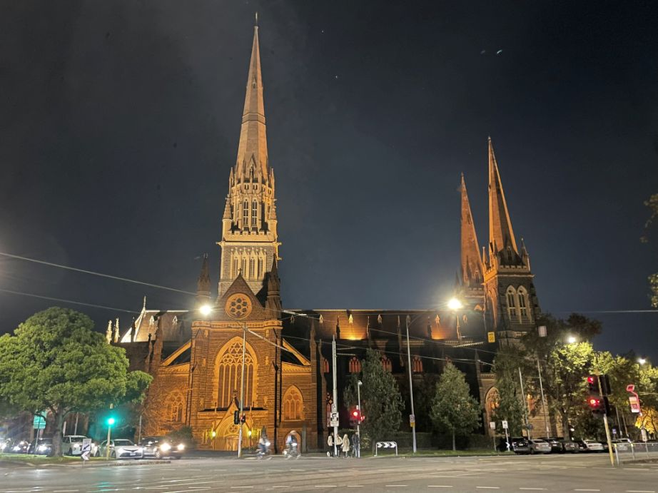 St. Patrick’s Cathedral has a dramatic Gothic Revival façade that immediately captures attention. Its dark bluestone walls contrast with lighter sandstone details, and the pointed arches, rose windows, and intricate tracery give it a soaring, medieval character. Twin spires rise high above the entrance, adding to the cathedral’s vertical elegance, while at night the lighting accentuates its sharp lines and rich textures.