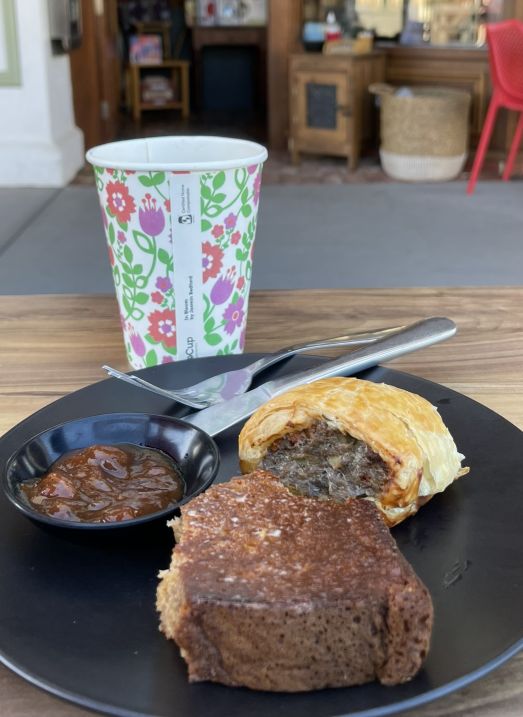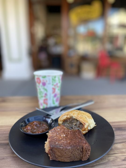 We sat outside and had a meat pie, sweet cinnamon brioche, and coffee.