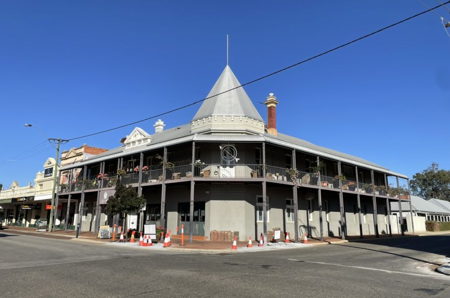 This corner building is the Imperial Hotel (sometimes called the Imperial Homestead Hotel), is a big two-story hotel on Avon Terrace with the double verandahs/metal balconies and the little pointed roof pediment at the corner. It was built in 1886 in a Victorian-filigree style and has been a prominent Avon Terrace landmark ever since.