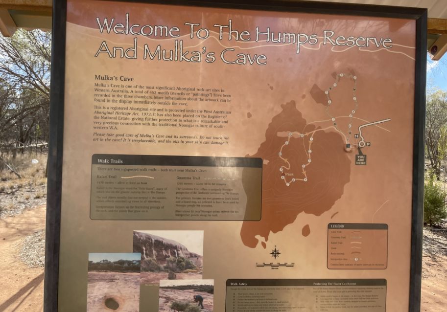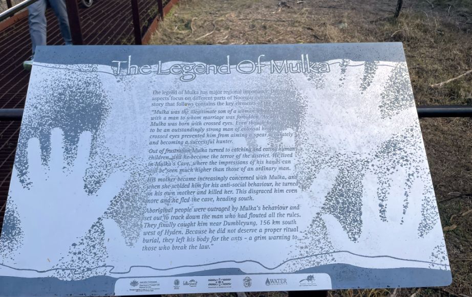 According to Noongar tradition, the cave is named after Mulka, the son of a woman who broke a sacred law by having a forbidden relationship. Because of this, Mulka was born with a deformity: his eyes were set so low on his face that he could not look forward, only downward. Even as a child, he grew unnaturally tall and powerful. Mulka was raised with love, but he struggled to fit into the laws and values of his people. As he grew older, he became unpredictable, restless, and finally violent. He began to attack travellers, then eventually turned to harming children in nearby camps. When his mother confronted him, Mulka reacted in rage and killed her. After the murder, Mulka fled into the bush, living in the granite landscape around what is now Hyden. The people of the region banded together and pursued him. Eventually, they caught him and punished him for breaking their most sacred laws. Mulka’s Cave is said to be one of the places he used as a shelter. The handprints on the cave ceiling are part of this story, they are believed to be the prints of people who once lived here, watching over the cave and preserving its memory.