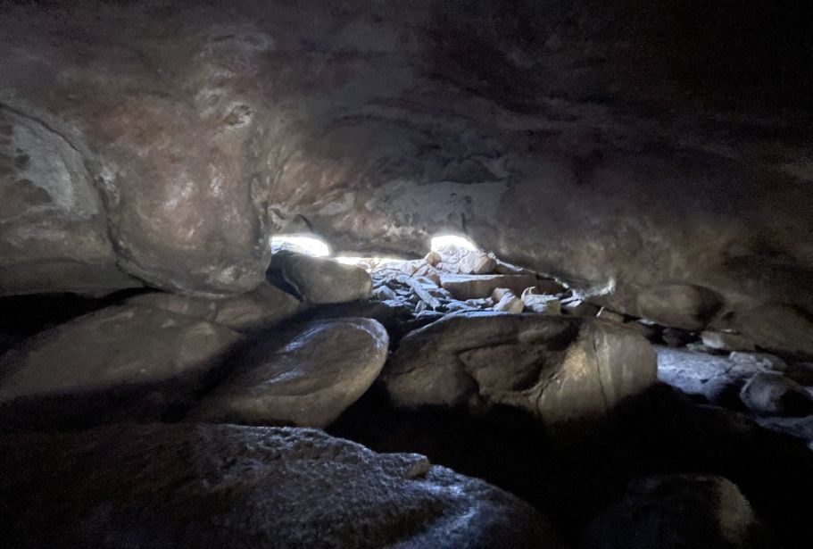 Scattered around the floor are large, rounded boulders, some leaning into the walls, others sitting like natural seats. They’ve been smoothed over time by weather and footsteps, giving the cave those familiar, curved granite shapes that are common in this landscape.
