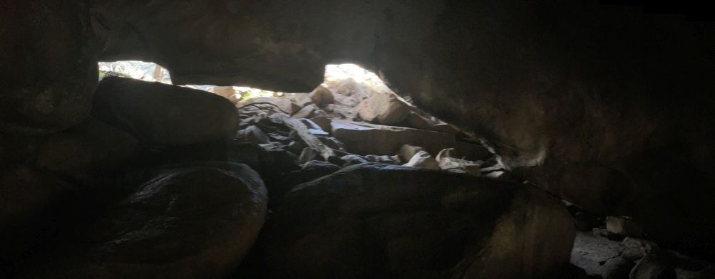 The entrance to the cave looks low and shadowed, almost hidden under an overhanging granite shelf.