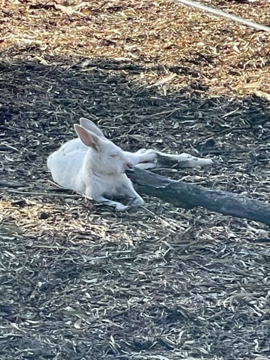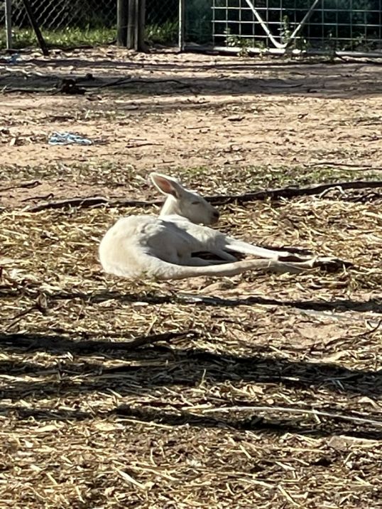 An Albino Kangaroo laying around the park. The white coloring is a result of a genetic condition called leucism (a partial loss of pigmentation) or albinism (complete lack of pigment). Seeing a white kangaroo in nature is extremely rare, making it a powerful symbol of uniqueness or the unexpected Australian experience.