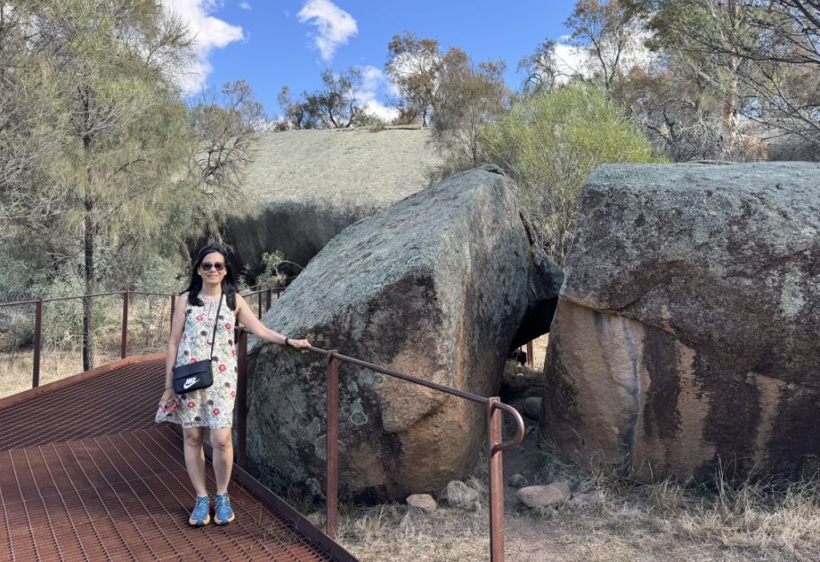 Inside Mulka’s Cave, the space feels cool and still, and the granite walls curve around you like a natural shelter. From where we are standing, we can see that the cave isn’t very deep, but the shapes of the rocks make it feel like a small maze carved into the stone.