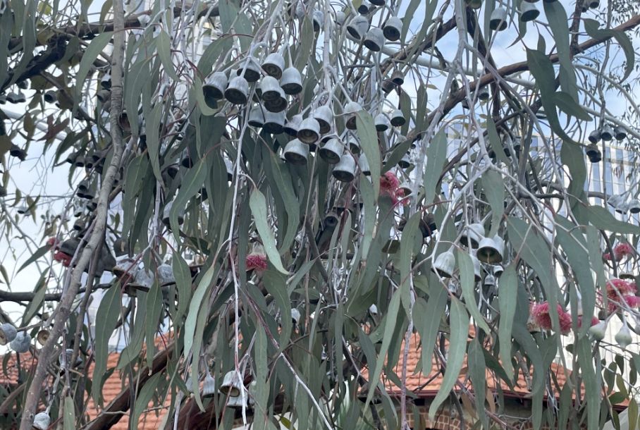 Each blossom hangs beneath a rounded, silvery bell-shaped bud cap, giving the tree a delicate, almost ornamental look. The contrast of the red petals, pale stems, and soft blue-green leaves makes them stand out beautifully against the morning light at Elizabeth Quay.