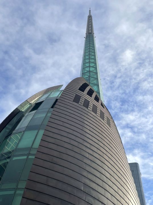 We are now at Barrack Square, standing in front of the Bell Tower with its fascinating, modern shape rising into the sky.