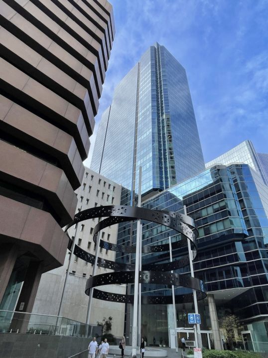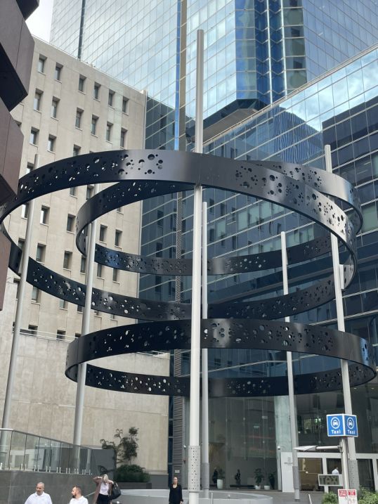We are now walking along St George’s Terrace, and ahead of us stands a striking metal sculpture with three enormous black circles suspended in the air, each one held up by sleek white metal beams. The contrast of the black rings and white supports gives it a bold, modern look right in the middle of the city.