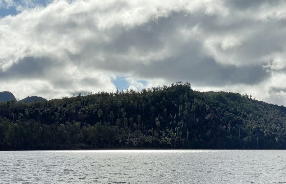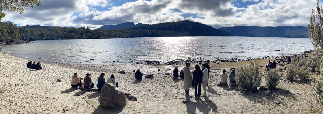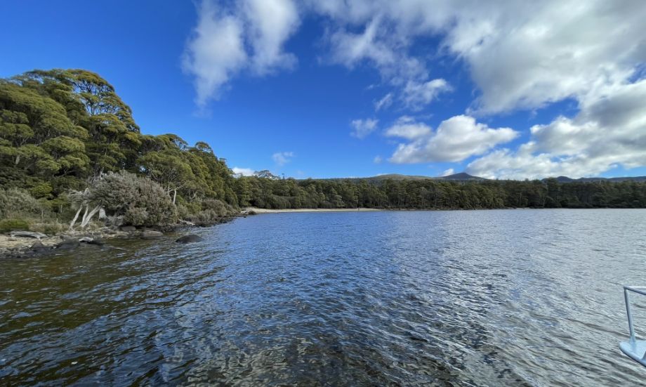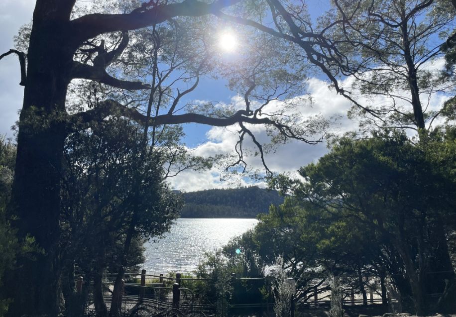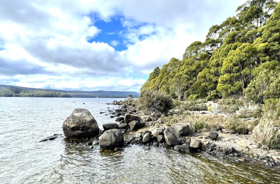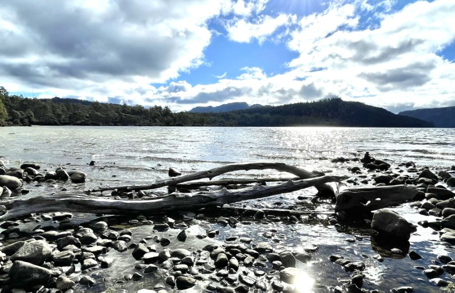 We sat down by the shore to take in the beautiful view of the calm lake. The water was perfectly still, everything felt peaceful. It was a quiet, soothing moment surrounded by pure Tasmanian wilderness.